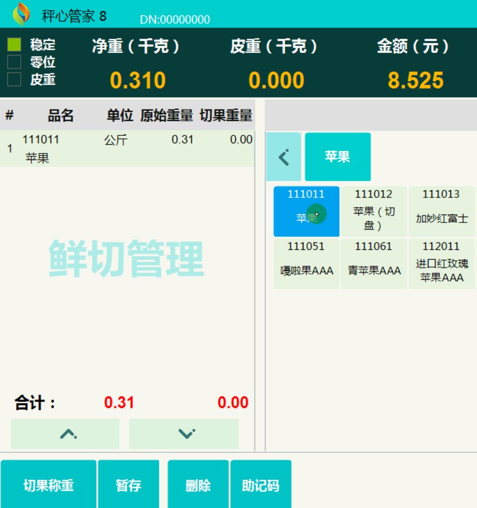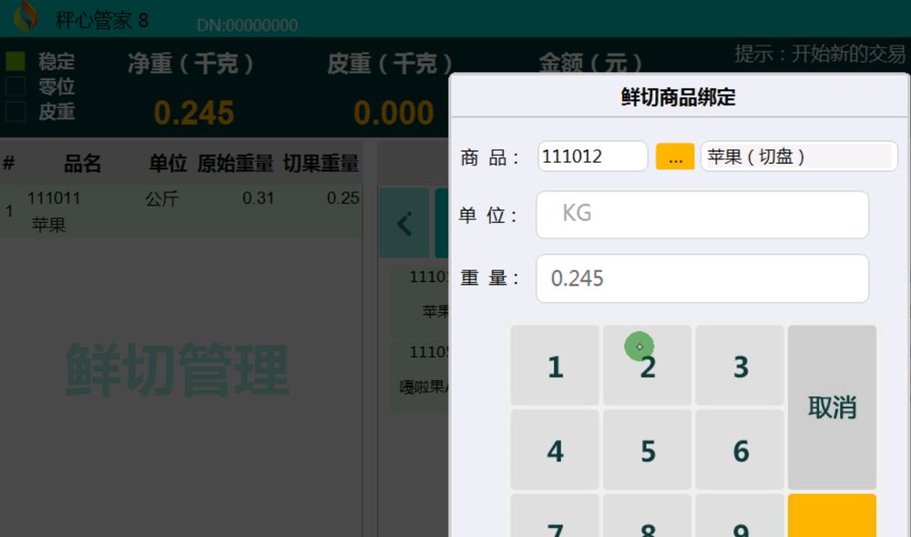 2、去皮切分后,将切分好的苹果切片放在秤上,点击“切果称重”得出鲜切后的重量。